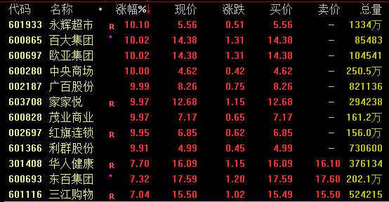 零售板块盘中再度活跃,截至收盘,永辉超市、百大集团、欧亚集团、家家悦、红旗连锁等涨停。